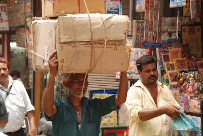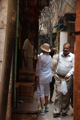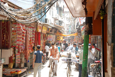 Later that week we went to the chain market in Old Delhi. This is the oldest part of the city where a lot of amazing markets are. It seems like there is a market for everything - spices, chains, beads, textiles, books, stationery, bangles, paper, etc. All the streets are very narrow and winding, with electrical wires draped across the tops of the alleyways, and wandering goats and cows mixed in with pedestrian, bicycle, motorbike, and rickshaw traffic. It’s like a labyrinth, jam-packed with people and products, in which you could easily get lost. I think it’s best to go with someone who is familiar with whichever market you want to go to, as there are lots of pic-pockets in the area, or as our taxi driver described to us, “walking man cheater.”