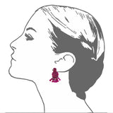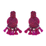 Small button earrings covered in woven rows of silk cords, with knotting at top. Bottom edge is adorned with tiny silk tassels and faceted crystal beads. Earrings are backed in leather and have sterling silver posts. Extremely lightweight.