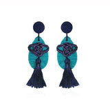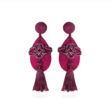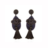 Earrings made of large raised teardrop bead wrapped in silk cording. Base teardrop is encased in a soutache knot with small tassel detail. The round post is wrapped in silk cord and is connected to large teardrop with a jumpring covered in plum silk. Earrings measure about 3” long x 1” wide and have sterling silver posts. The post is backed in leather. Very lightweight.