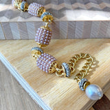 Linked bracelet made of micro-pavé half rondelle links, and blush pearl bead encrusted links. Bracelet measures about 5-3/4” long, has a lobster claw clasp, and a 2” long extender chain with rondelle capped bead detail.