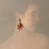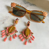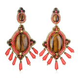1960s, vintage-inspired jeweled earrings made of large oval real semi-precious cabochons, edged in rows of 2mm real semi-precious faceted beads, with wire-wrapped teardrop-shaped dangling real semi-precious stones. Earrings measure about 3-3/8” long x 1-1/2” wide, are edged in metallic gold lurex threads, backed in ivory leather, and have sterling silver posts. Very lightweight.