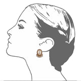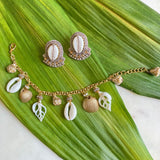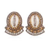 Button earrings embellished with cowry shells, rhinestones, and seed beads. Earrings measure about 1-1/4" long x 1" wide, have sterling silver posts, and are backed in leather. Extremely lightweight.