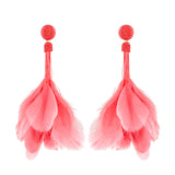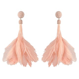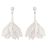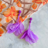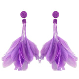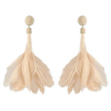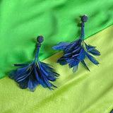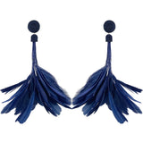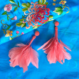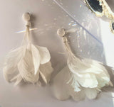 Elegant earrings made of stripped rooster feathers topped with silk cord-wrapped caps and posts. Earrings measure about 4-1/2" long. Posts measure about 1/2" in diameter, are sterling silver, and are backed in leather or suede. Extremely lightweight.