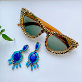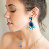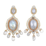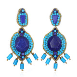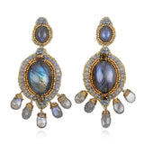 1960s, vintage-inspired jeweled earrings made of medium oval real semi-precious cabochons, edged in rows of 2mm real semi-precious faceted beads, with wire-wrapped dangling real semi-precious stones. Earrings measure about 2-3/4” long x 1” wide, are edged in metallic gold lurex threads, backed in ivory leather, and have sterling silver posts. Very lightweight.