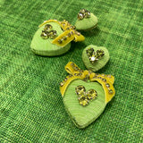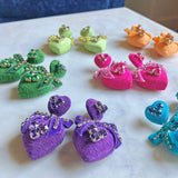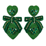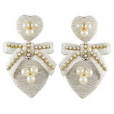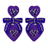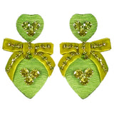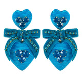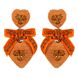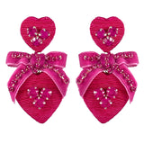 Silk cord-wrapped heart-shaped earrings, embellished with crystal rhinestones and velvet bows. Earrings measure about 2-3/8" long x 1-1/4" wide, have sterling silver posts backed in leather or suede, and are lightweight.