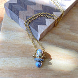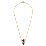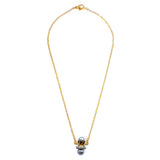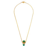 Semi-precious (malachite, lapis, or grey pearl) cabochon encrusted pendant with micro-pavé detail, attached to 24K gold plated chain. Chain measures about 15” long, and pendant measures about 3/4” long. Lobster claw clasp at back.