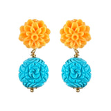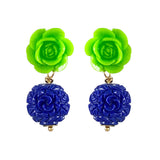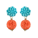 One-of-a-kind earrings inspired by the mythical Tibetan kingdom. Earrings are made of vintage findings: acrylic carved flower posts and intricately carved resin gumball beads. Earrings measure about 1-1/2" long x 5/8" wide, have sterling silver posts backed in leather, and are lightweight. Colorful, unique, and only one pair in each color made!