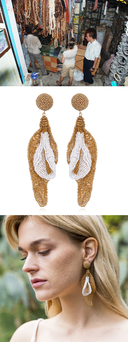 Each Suzanna Dai piece blends vintage glamour with modern flair and is delicately hand-crafted with materials sourced and inspired by locations around the world. The collection features a mélange of components, including metal threads, semi-precious stones, glass beads, silk cording, raffia, feathers, and sterling silver. Each design is backed on leather—making the pieces exceptionally lightweight and easy to wear.